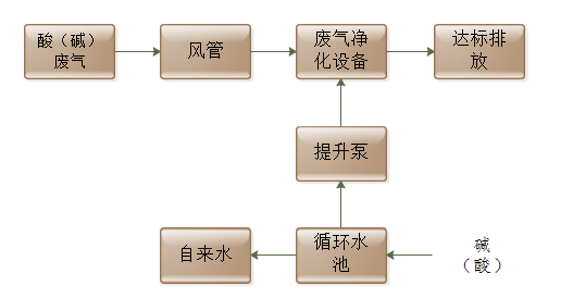 蝕刻廢氣分類 鹽酸霧主要是酸性蝕刻、活化等工序產(chǎn)生(在各個(gè)工序的微蝕段也會(huì)產(chǎn)生酸性氣體,例如內(nèi)層前處理的微蝕、內(nèi)層蝕刻后的酸洗、沉銅段的微蝕、板電的酸洗、DF顯影前的酸洗、pp的酸洗、ET的微蝕、WF前的酸洗、沉銀前酸洗微蝕、沉金前的酸洗微蝕、成品包裝前的酸洗)。 氨氣主要是堿性蝕刻銅工序產(chǎn)生。堿性蝕刻一般多用于外層板工段,是將露銅的銅面蝕刻掉,被錫覆蓋的銅面被保留。 廢氣處理 生產(chǎn)中的廢氣經(jīng)風(fēng)罩收集,經(jīng)管道由風(fēng)機(jī)進(jìn)入廢氣凈化塔的旋流裝置后,帶動(dòng)水面旋轉(zhuǎn)形成堿(酸)水霧與廢氣充分混合,經(jīng)此旋流裝置處理,污染物能被去除;塔體配置二級(jí)水浴裝置,經(jīng)二級(jí)噴淋裝置清洗后完全能保證達(dá)標(biāo)排放。凈化塔內(nèi)添加一定的填料,這樣可以使得廢氣和吸收液充分接觸,從塔上部流下來的水再通過水泵提升到塔頂,不斷循環(huán)使用,循環(huán)液(氫氧化鈉溶液/硫酸溶液)在達(dá)到一定濃度后再排向污水處理系統(tǒng)統(tǒng)一排放。 工藝流程圖 |